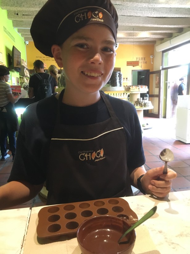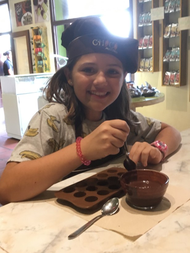 THE CHOCOLATE MUSEUM it is a shop full of testers and tasters plus a mini museum. Mom and I went and we were there for two hours. We tasted hot chocolate, chocolate ice tea, chocolate tea, chocolate coffee and of course lots chocolate! I tried to take some chocolate home for Rico but it half malted and got too tempting, so I ate it (shhh don’t tell Rico!!). The next day we went back to the chocolate museum after our walking tour, this time dad and Rico came too. Again, we tried more tasters; I thought that the chocolate face cream was food so I ate it- it was disgusting!!!! Rico and I signed up to do the chocolate tour where we would learn about the process of making chocolate from the bean and then get to create our own flavored chocolates.